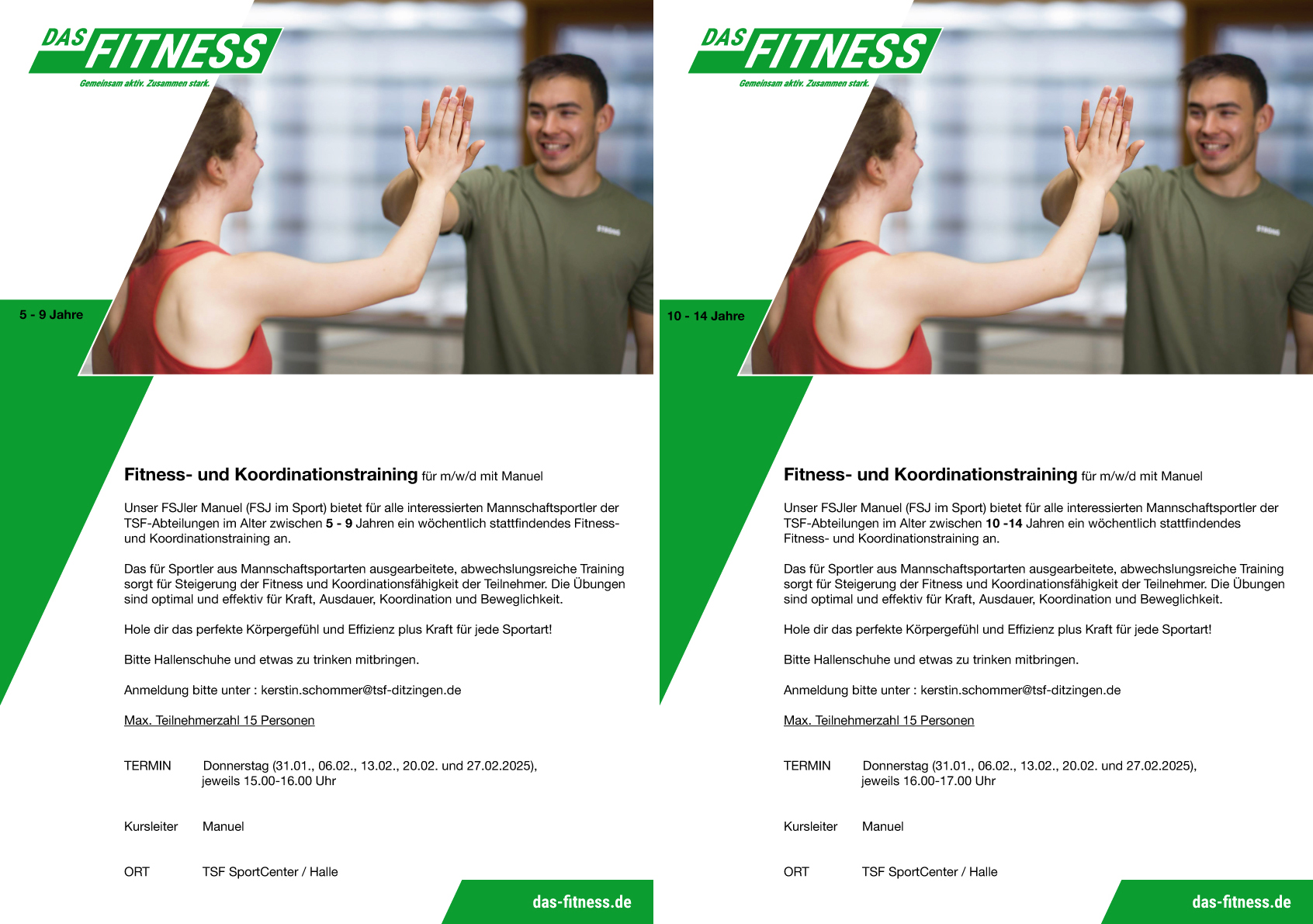 Unser FSJler Manuel bietet für alle interessierten Mannschaftsportler*innen der TSF im Alter zwischen 5 - 9 Jahren bzw. 10 und 14 Jahren ein wöchentlich stattfindendes Fitness-