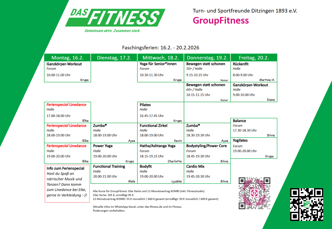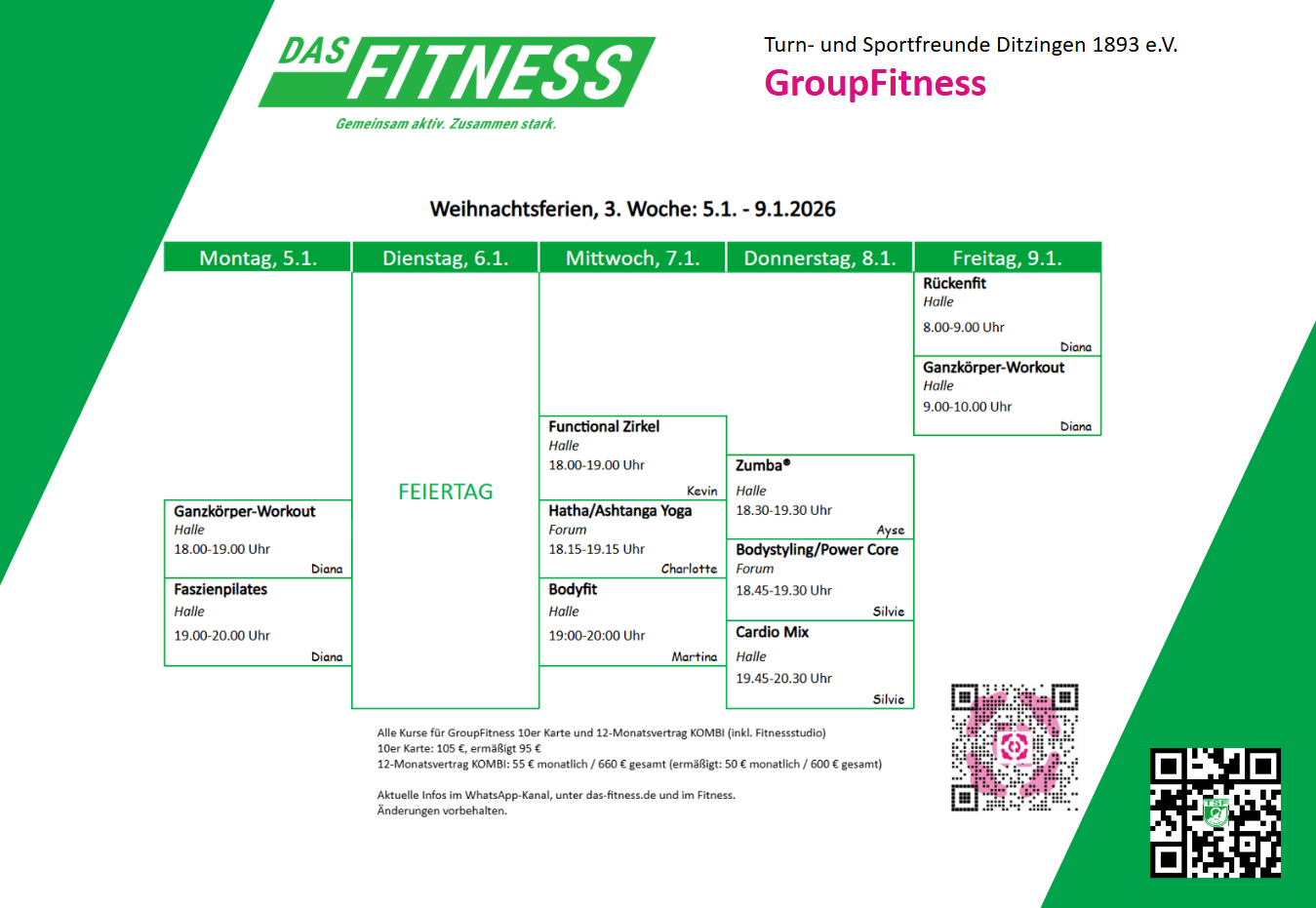 Es finden nur einzelne Termine statt, wie jeweils im WhatsApp-Kanal GroupFit mitgeteilt wird.